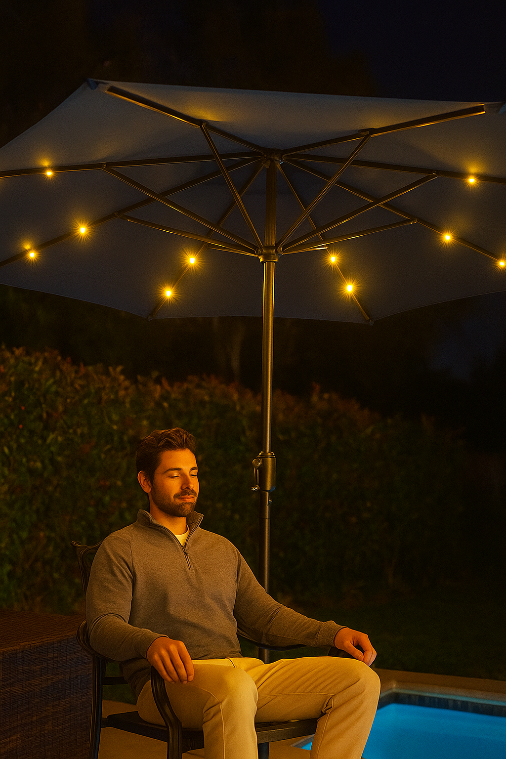 Great shade at lunch. Then the solar LEDs glow softly at dusk and the patio turns into a cozy hangout for the night.