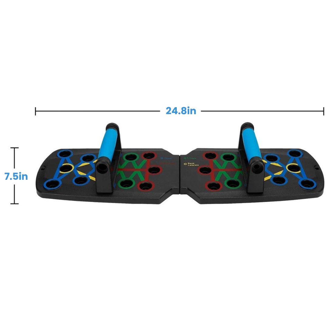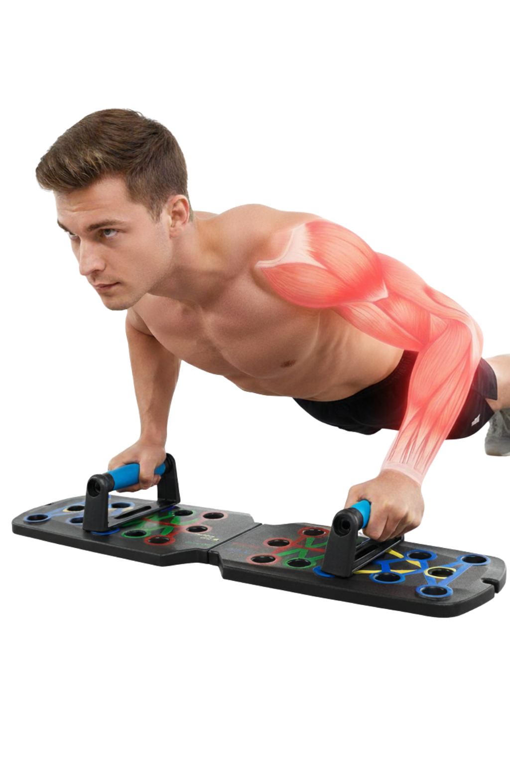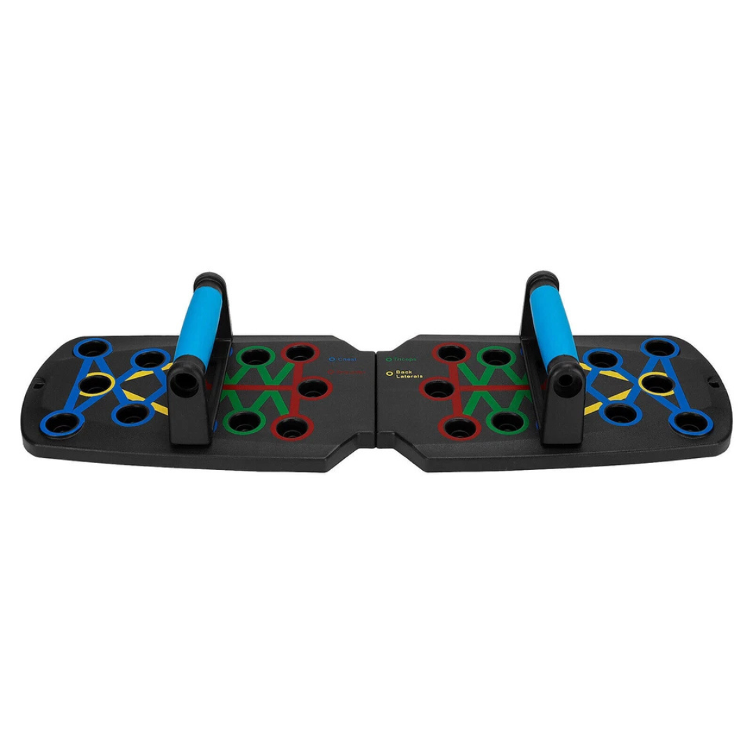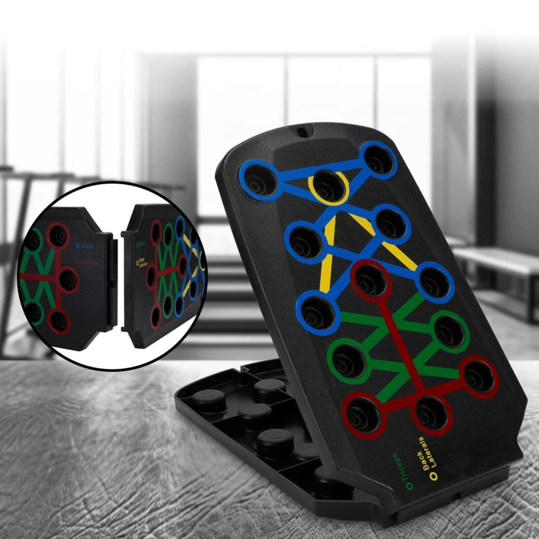 Place the board on a non-slip surface and insert the handles into the color-coded slots that correspond to the muscle group you wish to target